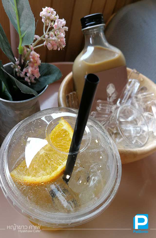 ไปกันสองคน เมนูที่เลือกสั่ง หนึ่งในนั้นเป็นเมนูซิกเนเจอร์ของร้าน นั่นคือ หญ้าขาวซิกเนเจอร์ ซึ่งเป็นกาแฟที่บรรจุอยู่ในขวด เสิร์ฟมาพร้อมน้ำแข็งที่วางอยู่ในชามไม้ และมีแก้วใบเล็กสำหรับรินมาทานทีละช็อต รสชาติจะมีความเป็นกาแฟที่รสชาติละมุน นุ่มด้วยส่วนผสมของนมครับ