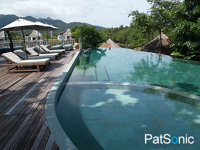 เราขึ้นไปถึงข้างบนที่เป็นสระว่ายน้ำอีกแห่ง พบว่า ที่นี่ วันนี้ ไม่มีใครขึ้นมาเลย นี่ถ้าเป็นช่วง High Season คงคึกคักไม่น้อย นอกจากมีสระน้ำแล้ว ก็ยังมีพื้นที่ที่วางโต๊ะทานข้าว ไว้ให้สำหรับแขกที่มาพัก สั่งอาหารให้มาส่งถึงบนนี้ได้ด้วย อะไรจะไฮโซปานนั้น