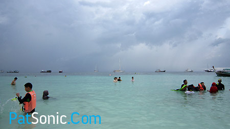 เมฆฝนลอยทะมึน ระหว่างที่เรือเฟอร์รี่ลอยอยู่เหนือน้ำทะเล เห็นแนวฝนที่ตกในทะเลอยู่ไม่ไกล เมื่อเรือลอยลำไปเรื่อยๆ ในที่สุด มันก็ตกอยู่ในวงล้อมของฝน เป็นครั้งแรกที่ต้องอยู่กลางทะเลที่ฝนกำลังตก น้ำฝนสาดกระเซ็นเข้ามาภายใน แม้เปียกก็ไม่ได้ใส่ใจอะไรมากนัก ภารกิจรักษากระเป๋ากล้องมาเป็นอันดับแรก เรือเริ่มลดความเร็วลงด้วยทัศนวิสัยที่แคบกว่าเดิม ในที่สุด ฝนซาลงพร้อมๆ กับที่เรือมาถึงเกาะไข่