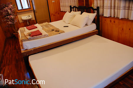 ห้องพักเป็นไม้สวยงาม มีม่านหรูดูโรแมนติก เสียดายที่ห้องของเราไม่มีระเบียงสวยๆ ไว้นั่งเล่นเหมือนอย่างห้องคนอื่นเขา ก็ได้แต่อาศัยระเบียงคนอื่นมาใช้ถ่ายรูปกันเพลินๆ ได้อยู่ ที่น่าสนใจก็คือ เตียงของเรามันใช้นอนได้ 4 คนเลยทีเดียว เสียดายที่ไม่มีใครมากับเราเพิ่ม จะได้มีคนช่วยหารค่าห้องได้อีก หุหุ