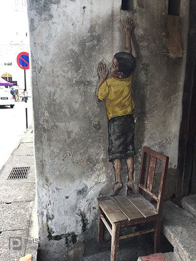 เดินมาจนถึงถนน Lebuh Cannon ก็จะเจอสตรีทอาร์ตอีกชิ้น เป็นภาพของเด็กชายที่ยืนเขย่งขาบนเก้าอี้ คล้ายจะเรียกคนข้างในอะไรประมาณนั้น