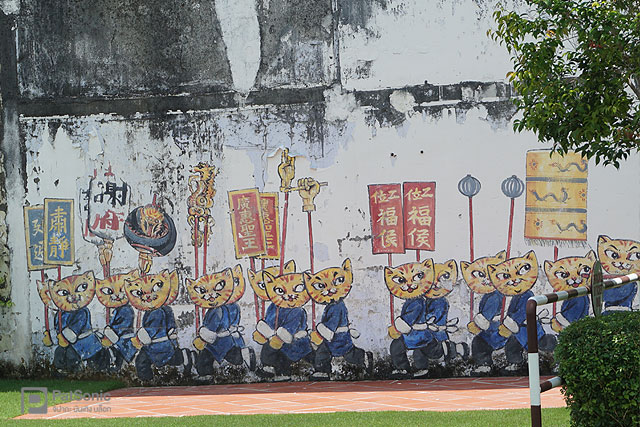 เดินเลี้ยวขวาไปจะเป็นถนน Lebuh Pantai จะพบหมู่อาคารสวยโอ่อ่าทว่าประตูปิด อาคารนั้นมีชื่อว่า Seh Tek Tong Cheah Kongsi ด้วยความตาดีจึงเหลือบไปเห็นภาพวาดรูปขบวนหมู่แมวเข้าพอดี เก็บมาฝากจนได้