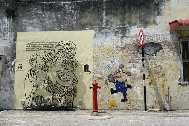 การเดินของเราอาจดูไม่เป็นระบบเท่าไหร่ เปลี่ยนทางไปยังแถว Kapital Keling Mosque มัสยิดที่มีความสวยงามอีกแห่งในปีนัง อายุราว 125 ปี เราเดินมาทางเส้น Lebuh Ah Quee ที่นี่จะเจอหลายจุด รวมถึงภาพมินเนี่ยนก็อยู่ที่นี่ด้วย