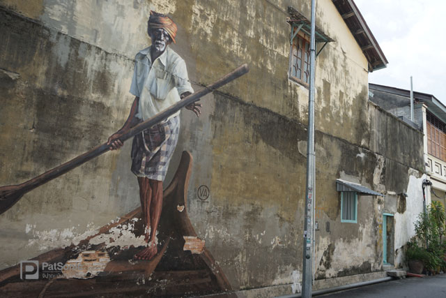 เมื่อเราเดินย้อนกลับไปจนถึงถนน Lorong Stewart ซึ่งจริงๆ มันก็ต่อกันกับ Lebuh Muntri นั่นแหละ ก็จะพบภาพของคุณลุงที่ยืนพายเรืออยู่ ภาพนี้ต้องเดินเข้าไปในซอยเล็กๆ แต่ก็หาไม่ยากอะไร