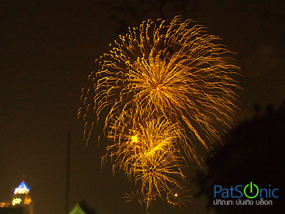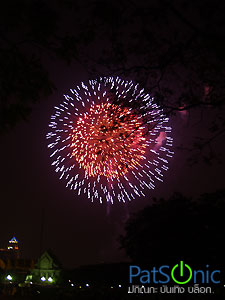 เมื่อเดินมาถึงแถวสระน้ำ ก็พบผู้คนยืน-นั่งถ่ายภาพดอกไม้ไฟกันเพียบ งานนี้ ขอแจมเสียหน่อย แต่ดันลืมเอาขาตั้งกล้องติดมือมาเสียได้ ไม่้เป็นไร ใช้มือเปล่าๆ นี่แหละ ถ่ายเอา ผลที่ได้ก็เลยเป็นแบบนี้