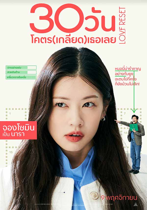 ‘Love Reset’ เป็นภาพยนตร์คอมเมดี้-โรแมนติกผลงานใหม่ของผู้กำกับ นัมแดจุง ที่เคยฝากผลงานมาแล้วจาก ‘Homme Fatale’ และ ‘The Last Ride’ หนังเรื่องสร้างปรากฏการณ์ฮากรามค้างอย่างต่อเนื่องด้วยการทำยอดขายตั๋วทะลุ 1.8 ล้านใบในเกาหลี (ณ วันที่ 31 ตุลาคม 2566) พร้อมครองอันดับ 1 บ็อกซ์ออฟฟิศเกาหลียาวนานกว่า 3 สัปดาห์ บทสรุปของมหากาพย์รักพัง ๆ ครั้งนี้จะ ‘รอด’ หรือจะ ‘ร่วง’ ร่วมค้นหาคำตอบได้ใน ’30 วันโคตร(เกลียด)เธอเลย’