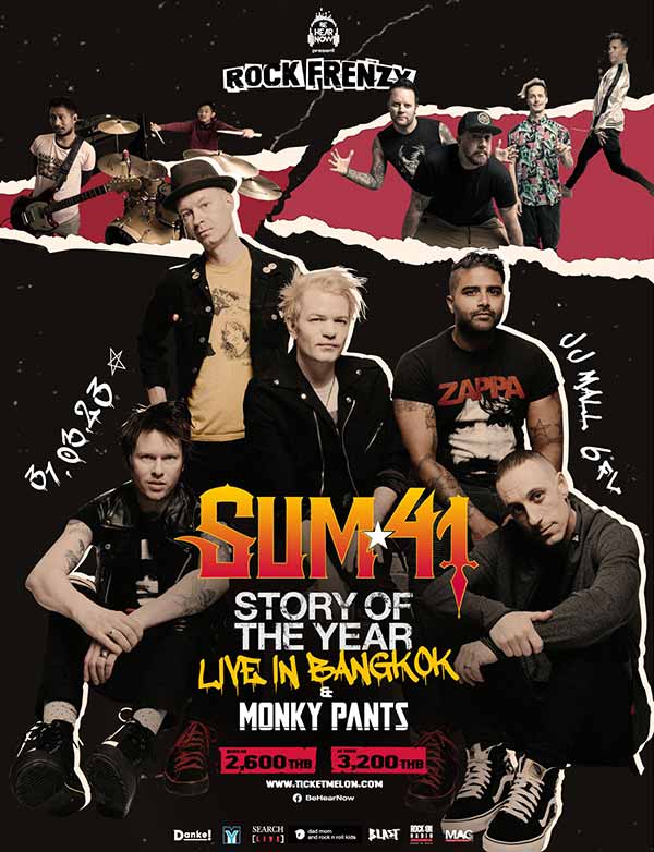 ปลายเดือนมีนาคมนี้ กรุงเทพฯ จะต้องลุกเป็นไฟ เพราะอากาศหน้าร้อนที่ว่าพีคสุดแล้ว มาเจอกับเทศกาลดนตรีร็อกสุดเดือดอย่าง Be Hear Now Rock Frenzy Live in Bangkok 2023 ที่มาพร้อมกับไลน์อัพสุดร้อนแรง จะต้องยิ่งร้อนระอุอย่างแน่นอน เพราะครั้งนี้ได้วงป็อปพังก์ระดับตำนานจากแคนาดา ที่ขึ้นชื่อว่าเป็นตัวตึงเรื่องการแสดงสดที่เยี่ยมยอดอย่าง Sum 41 มานำทัพเขย่าเวที ซึ่งนับเป็นการกลับมาระเบิดความมันส์สร้างความประทับใจให้สายร็อกในไทยอีกครั้งในรอบ 10 ปีของพวกเขา การันตีด้วยลิสต์เพลงฮิตชวนโยก ไม่ว่าจะเป็น ‘Into the deep’, ‘Fat Lip’, ‘Still Waiting’ และอีกมากมาย